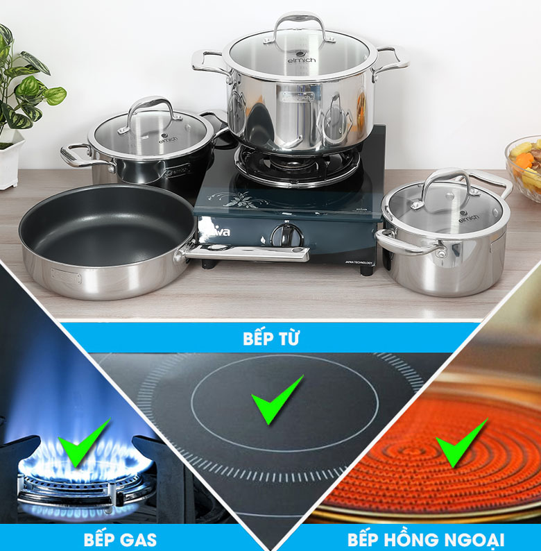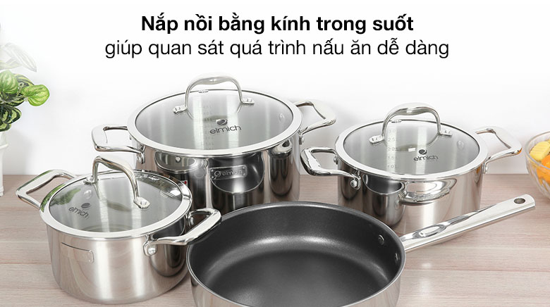 Bộ 3 nồi 1 chảo inox 3 đáy Elmich Trimax XS EL-3744 thiết kế hiện đại, an toàn phù hợp sử dụng trong gia đình hoặc có thể sử dụng cho nhà hàng, cửa hàng ăn uống.