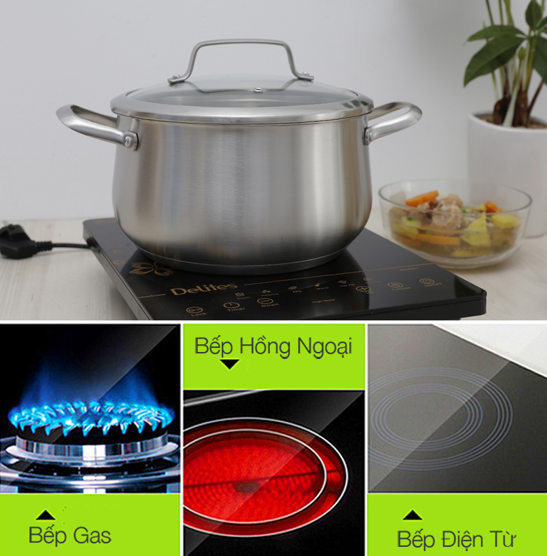 Nồi inox 3 đáy Delites 24 cm 001NCH sang trọng, bền tốt, gia dụng an toàn cho nấu nướng gia đình.