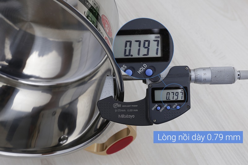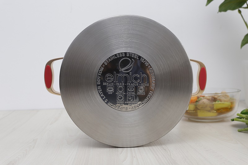 Đáy gồm các lớp là inox 430, nhôm nguyên chất, hợp kim nhôm, nhôm nguyên chất và lớp trong cùng tiếp xúc với thức ăn là inox 304, tuyệt đối an toàn, không phản ứng với thức ăn.