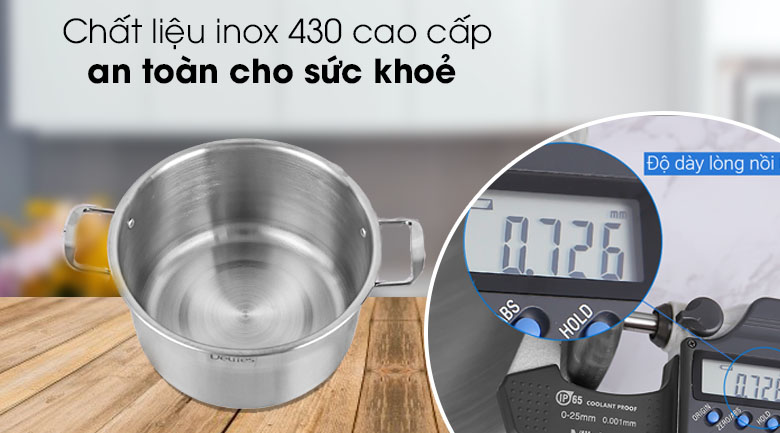 Sử dụng chất liệu nồi inox có độ bền cao, không bị oxy hoá, an toàn khi nấu ăn không bị nhiễm các chất độc hại. Nồi dày 0.726 mm.
