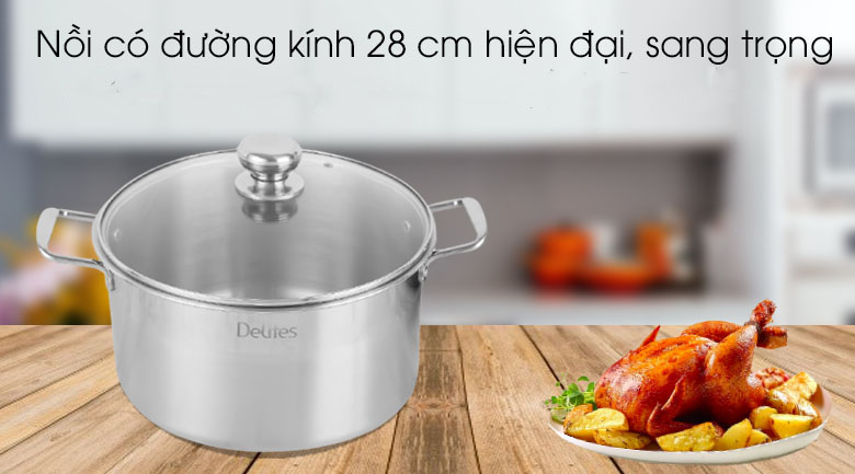 Đường kính nồi 28 cm có thể hầm gà, vịt nguyên con 2 - 2.5 kg.