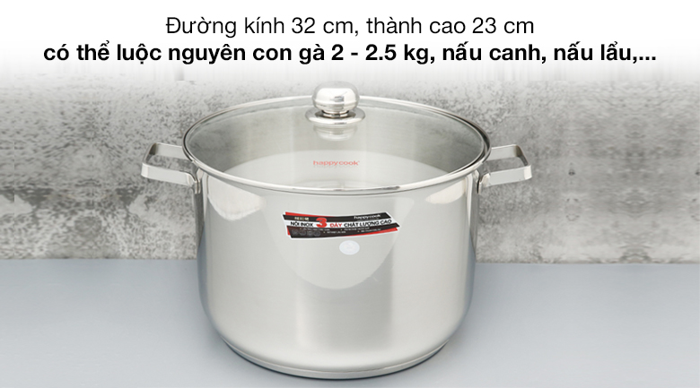 Nồi inox 3 đáy nắp kính 32cm Happycook NC-32G thiết kế sang trọng, thành cao có thể luộc gà nguyên con 2 - 2.5 kg, chất liệu bền bỉ, nấu ăn an toàn, đáp ứng tốt nhu cầu gia đình khoảng 12 người.