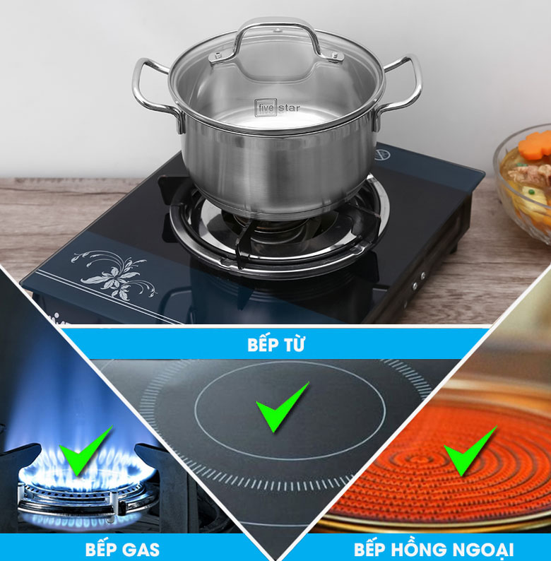 Nồi inox 3 đáy nắp kính 18 cm Fivestar N18-5DG 304 đẹp, bền, sử dụng đa dạng bếp, là đồ gia dụng an toàn, không thể thiếu trong căn bếp của mỗi gia đình.