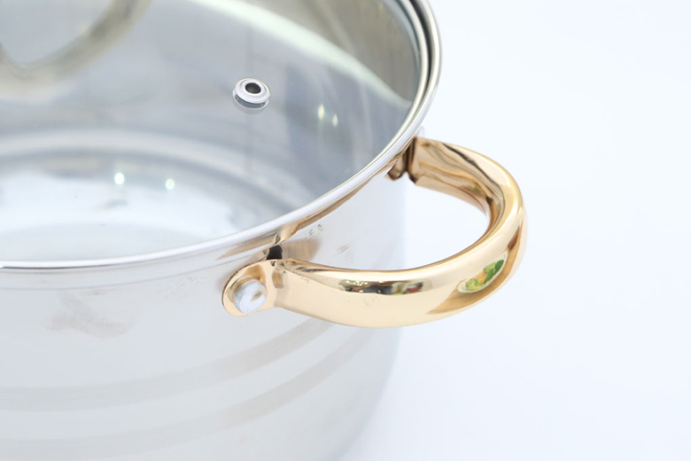 Nồi có tay cầm mạ màu vàng bắt mắt, thiết kế chắc chắn, tiện di chuyển.