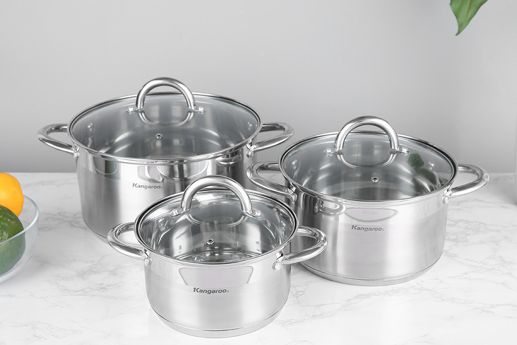 Bộ 3 nồi inox 5 đáy Kangaroo KG876 là lựa chọn mua sắm thông minh cho người nội trợ với nhiều sản phẩm dễ dùng nấu ăn đa dạng, độ bền cao, giá cả hợp túi tiền.