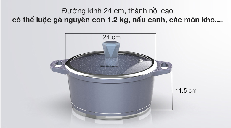 Nồi nhôm chống dính nắp kính 24 cm Sunhouse SHG2024MMA thiết kế gọn nhẹ, chống dính, dày bền, màu xanh xám nhã nhặn, phù hợp với nhiều không gian bếp, đáp ứng tốt nhu cầu nấu ăn cho gia đình 4 - 5 người.
