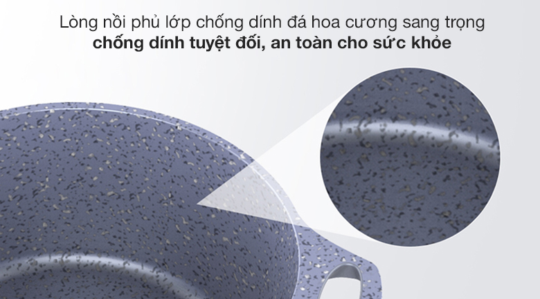 Lớp chống dính không chứa PFOA, không phản ứng với thức ăn và an toàn tuyệt đối cho sức khỏe.