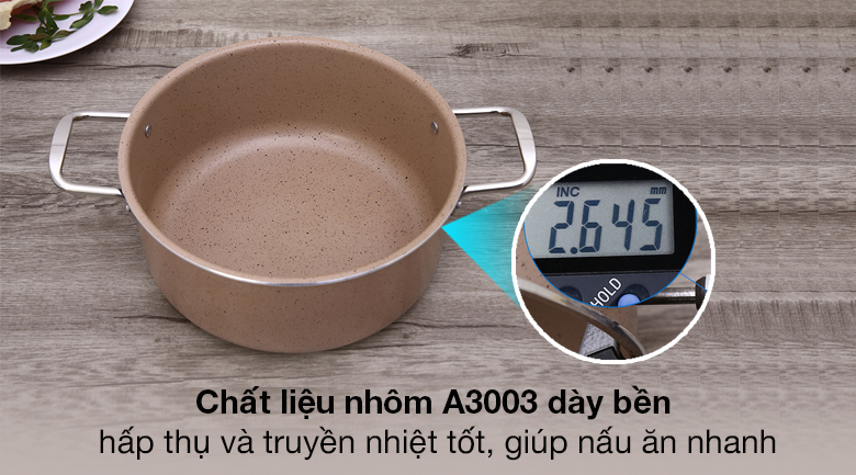 Độ dày thành nồi 2.645 mm chống móp méo tốt, cho khả năng giữ nhiệt lâu giúp nấu ăn nhanh hơn, thức ăn ấm nóng thơm ngon cho bữa ăn gia đình.