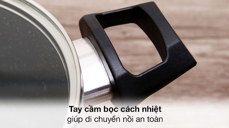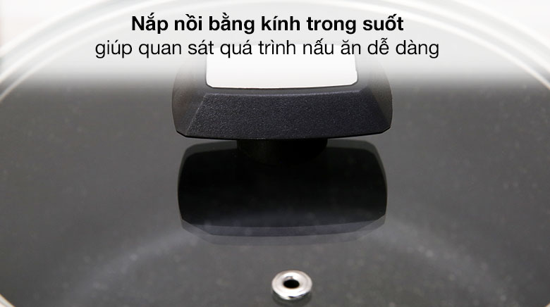 Nắp nồi bằng kính tiện quan sát thực phẩm trong quá trình nấu với núm bọc cách nhiệt giúp mở nắp nồi an toàn.