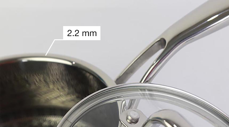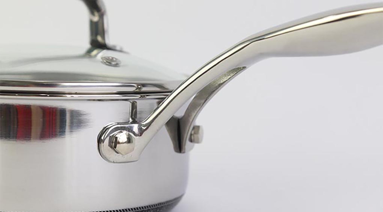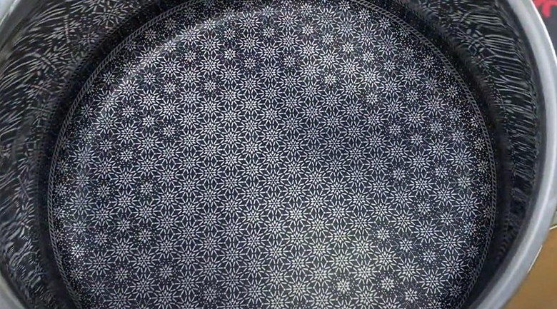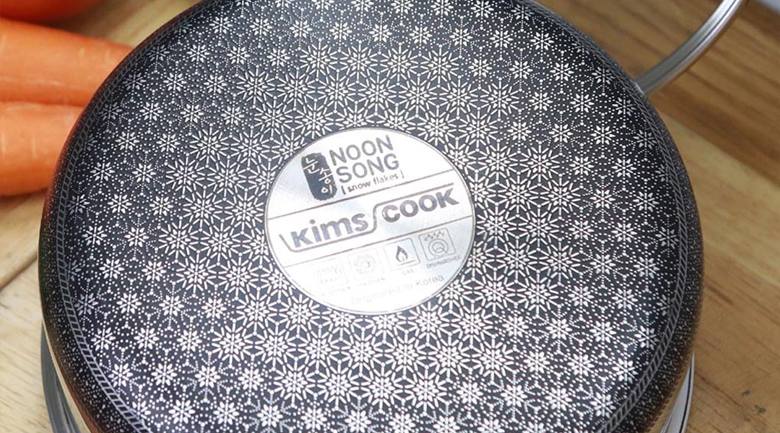 Mặt đáy quánh khoan khắc hình bông tuyết. Phần hoa văn nổi lên là inox, phần nền màu đen là lớp chống dính. Thiết kế này không chỉ tăng vẻ độc lạ cho quánh mà còn hạn chế dầu mỡ bám vào, dễ dàng vệ sinh, không bị ố vàng theo thời gian.