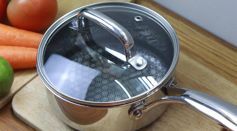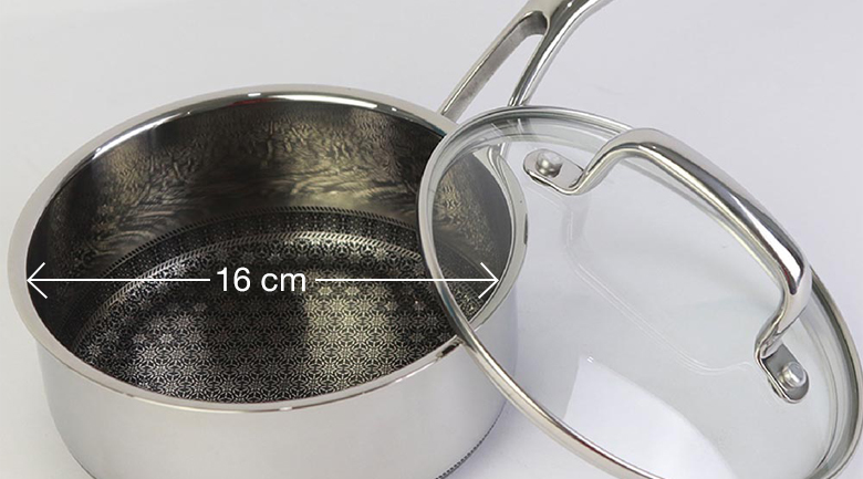 Quánh inox 3 đáy nắp kính 16 cm Kims Cook N316M tạo nên bởi công nghệ Blackcube Noon Song 2 mặt tiên tiến vân lục giác giúp chống trầy xước, an toàn cho sức khỏe, sử dụng nấu ăn tiện lợi, đáp ứng nhu cầu nấu nướng của 1 - 2 người.