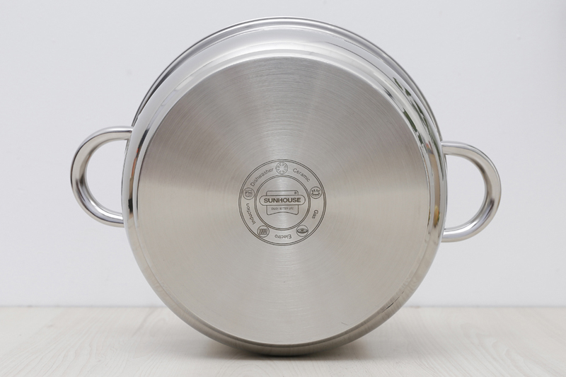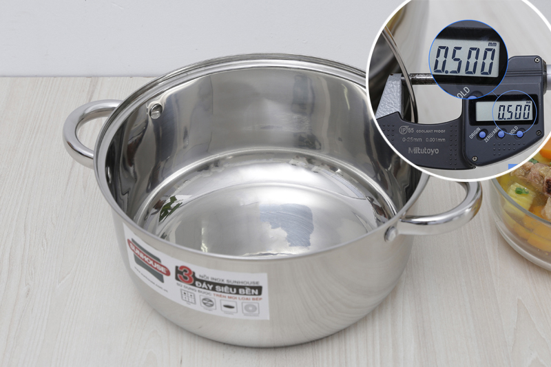 Cấu tạo đáy nồi phẳng, dày 3 lớp (inox 430 – nhôm - inox 201). Inox 430 có đặc tính nhiễm từ, ít phản ứng với thức ăn, không độc hại. Lớp nhôm ở giữa giúp nồi thu nhiệt nhanh chóng, truyền nhiệt đều để món ăn thêm ngon, inox 201 hình thành lớp thứ 3 sản phẩm được dày dặn chắc chắn hơn.