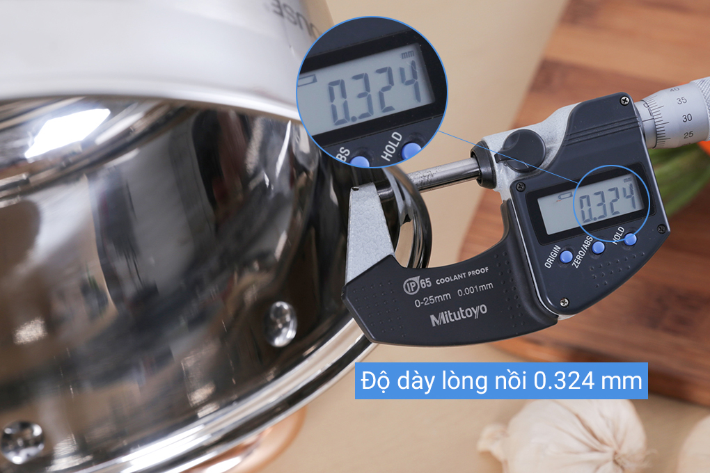 Đáy phẳng cấu tạo 5 lớp: Inox 430 - Nhôm nguyên chất - Hợp kim nhôm - Nhôm nguyên chất - Inox 201 dày chắc, gia nhiệt nhanh, truyền nhiệt đều, nấu ăn ngon.