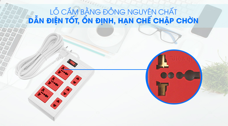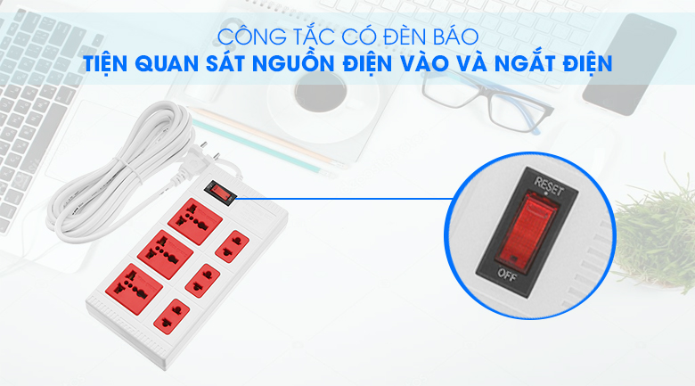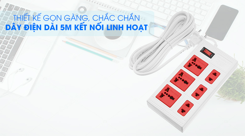Ổ cắm điện có dây dài 5m cho phép người dùng sử dụng linh hoạt ở nhiều địa điểm khác nhau, đặc biệt là ở địa điểm cách xa ổ cắm chính tiện lợi.
