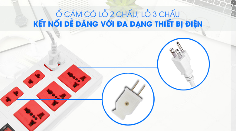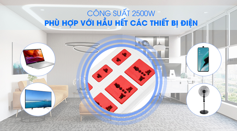 Sử dụng được mọi loại phích cắm, tiện dụng, linh hoạt nhờ công nghệ Extra Power tăng khả năng đàn hồi cho lỗ cắm, tương thích với mọi tiêu chuẩn phích cắm.