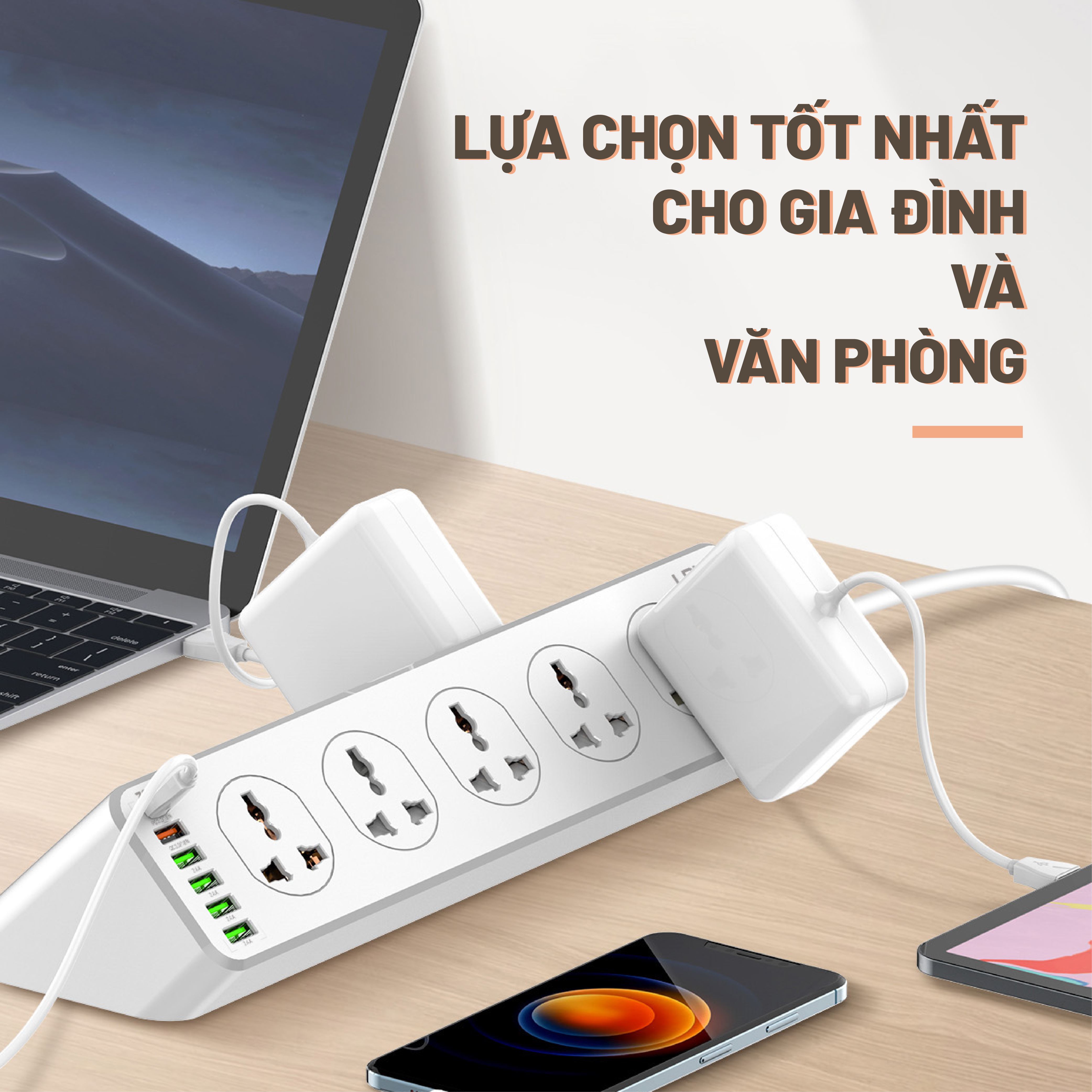 Ổ cắm điện có thiết kế hình chữ nhật dài, gam màu trắng tinh tế, dễ dàng bố trí trong nhiều không gian nội thất khác nhau. Kích thước tổng thể khoảng 36 × 9 × 9 cm, cùng khối lượng chỉ 0,9kg, cho phép bạn dễ dàng di chuyển hoặc mang theo khi cần thiết. Vỏ ngoài được chế tạo từ nhựa ABS cao cấp, có khả năng chịu nhiệt lên đến 850°C và chống cháy, đảm bảo độ bền cũng như sự an toàn trong quá trình sử dụng. Dây điện dài 2 mét, vỏ bọc chắc chắn, chống đứt gãy và cách điện tốt, thuận tiện cho việc bố trí thiết bị ở các vị trí xa ổ điện tường. Ổ cắm gồm 10 ổ cắm điện được bố trí hợp lý, tạo khoảng cách đủ rộng để cắm các củ sạc lớn cùng lúc mà không bị vướng.