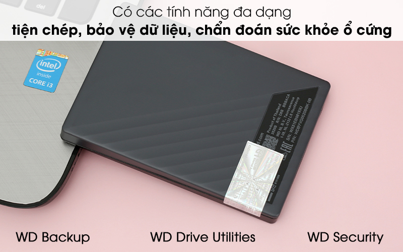 Ổ cứng di động bao gồm các tính năng WD Backup tự động sao lưu các dữ liệu theo yêu cầu, WD Drive Utilities theo dõi sức khỏe ổ cứng trong khi đó tính năng WD Security cho phép bạn cài đặt mật khẩu cho WD My Passport đảm bảo an toàn cho các dữ liệu quan trọng.