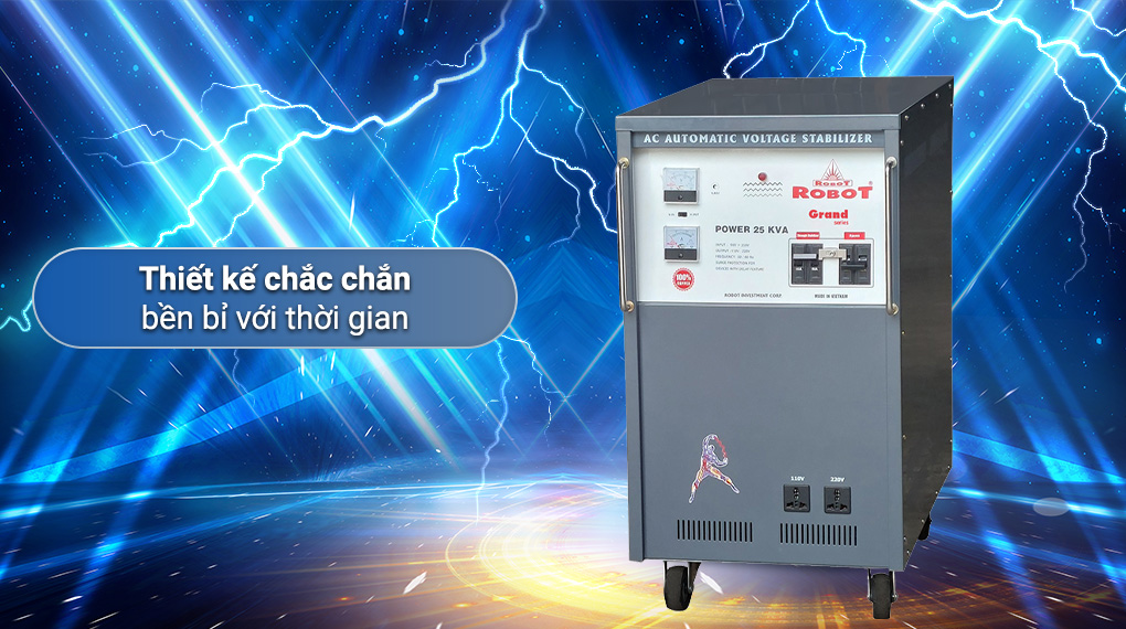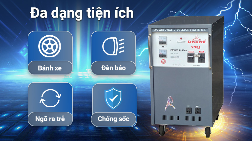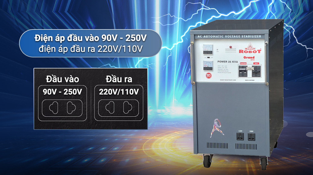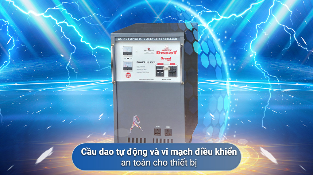 Ổn áp Robot 1 pha 25KVA 90 sử dụng để ổn định lưới điện trong hộ gia đình hoặc văn phòng, tránh tình trạng điện áp hoạt động chập chờn ảnh hưởng đến tuổi thọ của các thiết bị điện cũng như hiệu suất công việc.