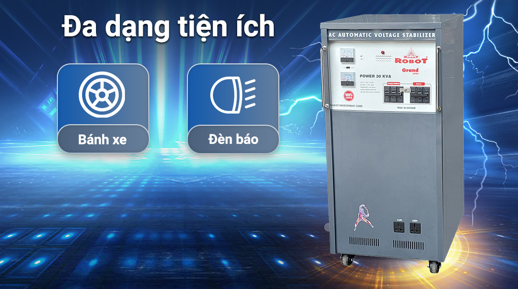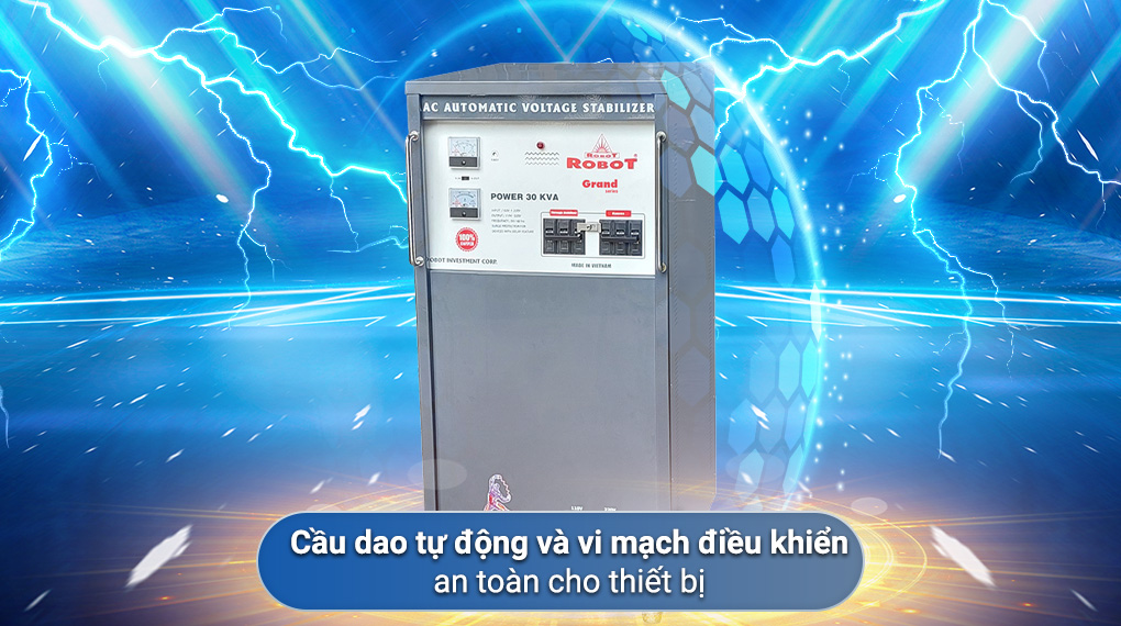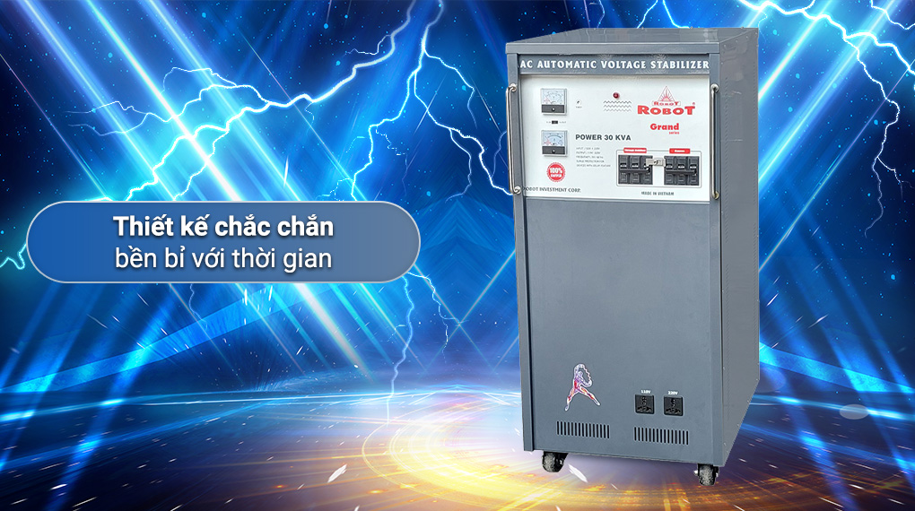 - Máy ổn áp này hoạt động mạnh mẽ với công suất 30 KVA, giúp cân bằng nguồn điện để bảo vệ thiết bị điện dân dụng, công nghiệp khỏi hư hỏng khi điện áp vào chập chờn quá yếu hoặc quá lớn so với công suất.