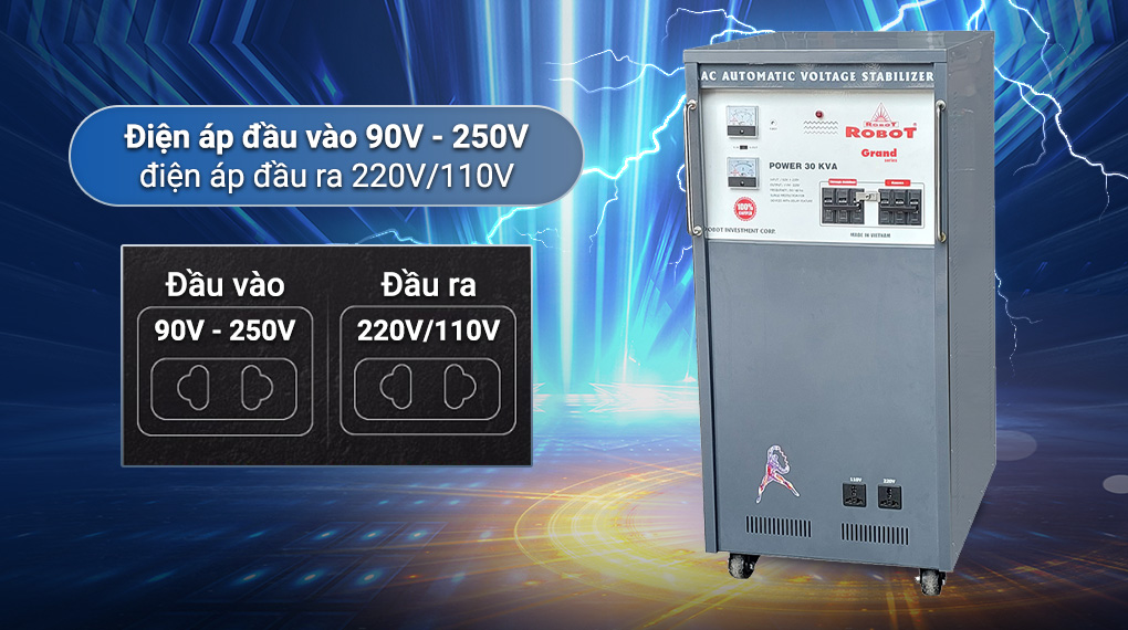 Tóm lại, ổn áp Robot 1 pha 30KVA 90 thuộc dòng ổn áp 1 pha, dùng để ổn định mạng lưới điện trong hộ gia đình hoặc văn phòng, góp phần nâng cao tuổi thọ cho các thiết bị điện trong nhà.