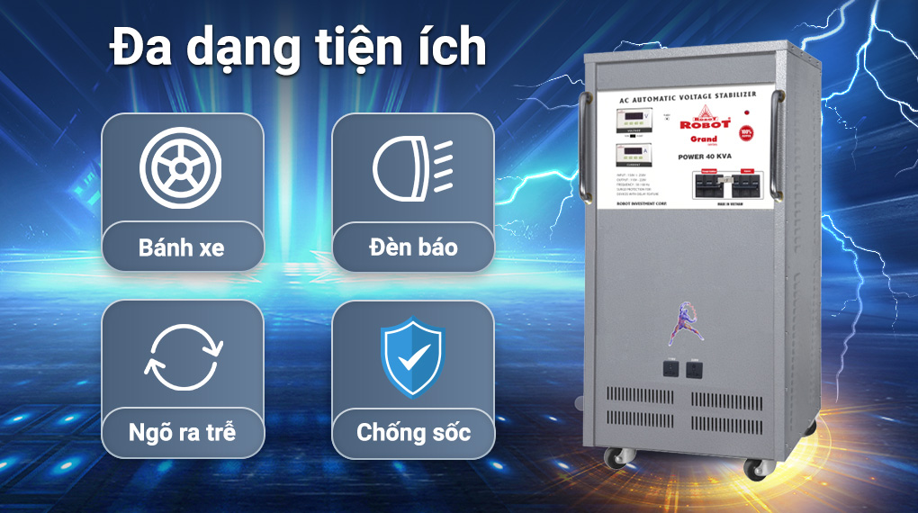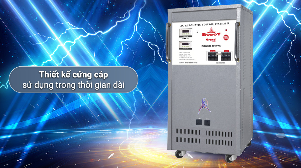 - Máy ổn áp này hoạt động mạnh mẽ với công suất 40KVA, giúp cân bằng nguồn điện để bảo vệ thiết bị điện dân dụng, công nghiệp khỏi hư hỏng khi điện áp vào chập chờn khi quá yếu hoặc quá lớn so với công suất.