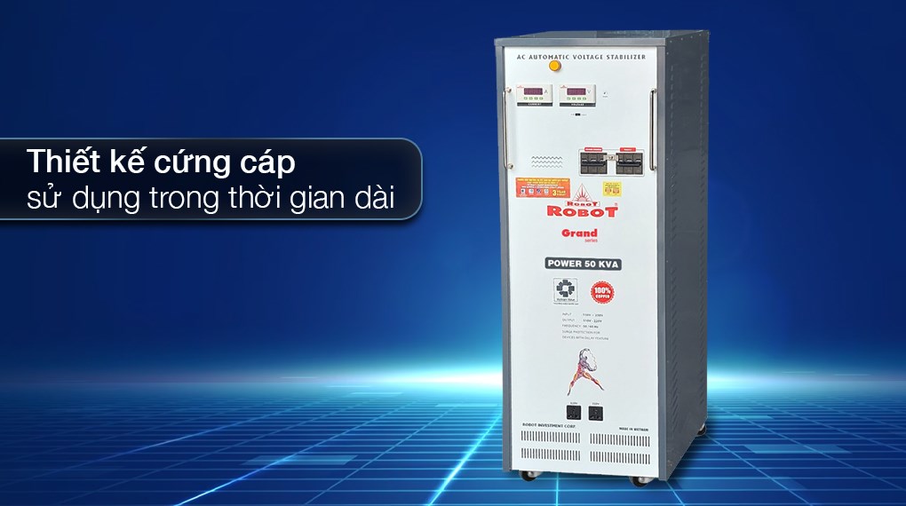 Hoạt động công suất 50KVA, ổn áp Robot này giúp ổn định điện áp đầu ra cho dù điện áp đầu vào có cao hơn hoặc thấp hơn danh định, phù hợp với mạng lưới điện Việt Nam hiện nay, nhờ đó tăng cường độ bền cũng như hỗ trợ khả năng hoạt động của các thiết bị điện được sử dụng.