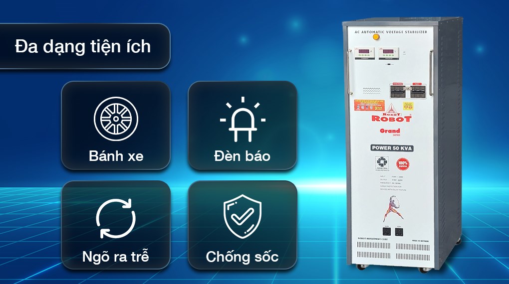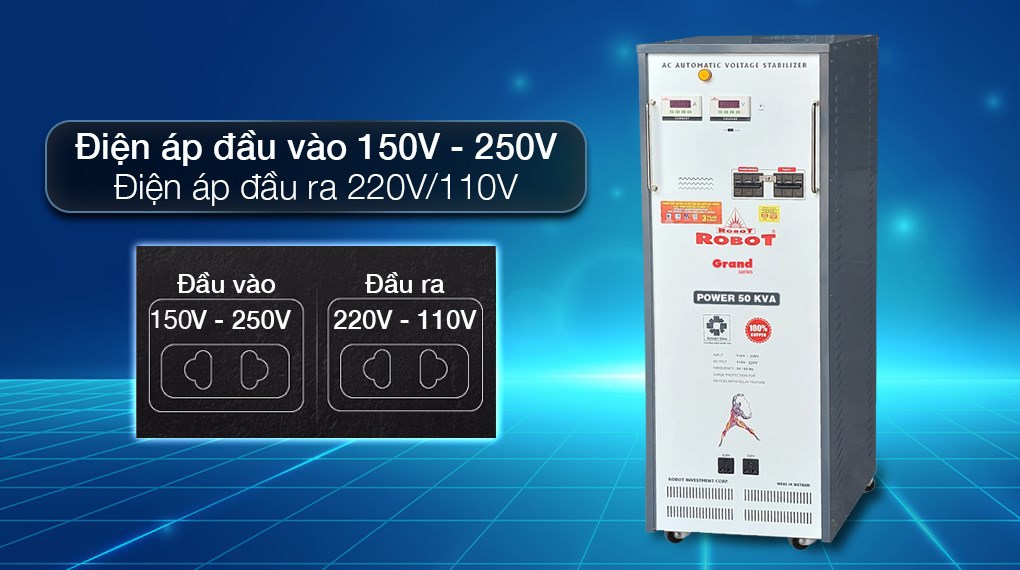 Máy ổn áp Robot 50KVA 150 có thể chuyển đổi điện áp đầu vào 150V - 250V thành điện áp đầu ra 220V/110V, để phù hợp hơn với nhu cầu sử dụng của các hộ gia đình tại Việt Nam.