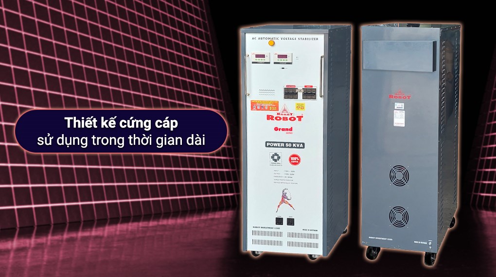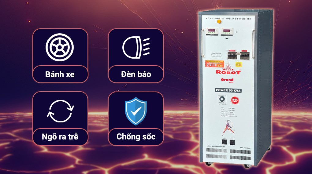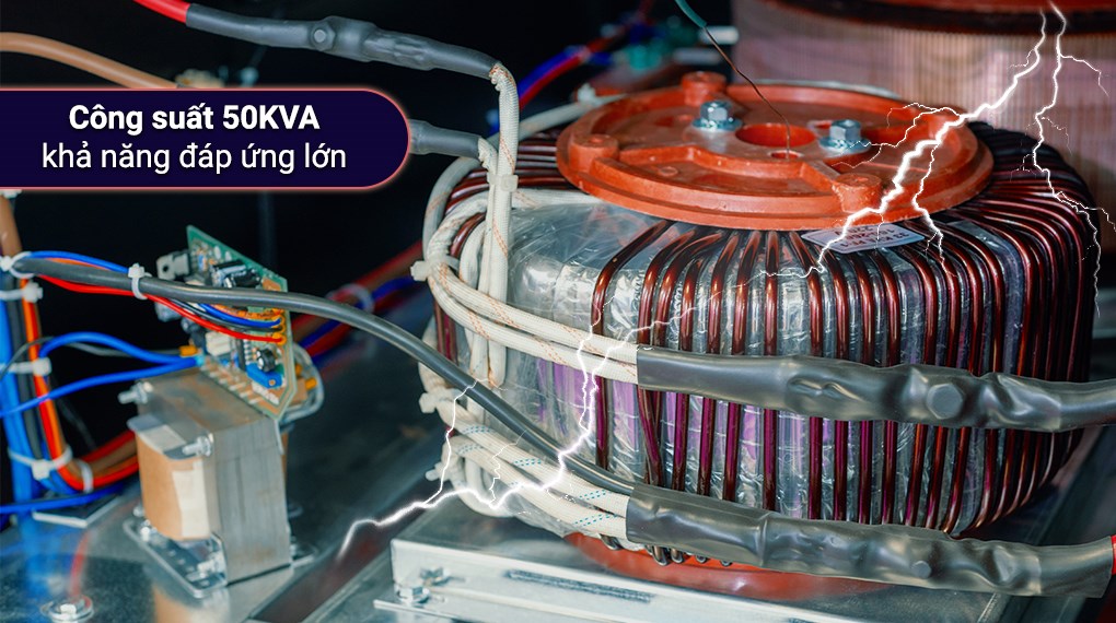 Chiếc máy ổn áp Robot 1 pha này hoạt động công suất mạnh mẽ 50KVA, có khả năng chuyển đổi điện áp đầu vào cao thành điện áp đầu ra thấp hơn, phù hợp với mạng lưới điện áp tại Việt Nam.