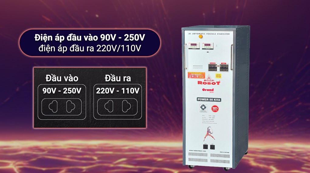 - Mẫu ổn áp 50KVA này có khả năng chuyển đổi điện áp đầu vào 90V - 250V sang điện áp đầu ra 220V/110V, phù hợp với mạng lưới điện được sử dụng phổ biến tại Việt Nam.