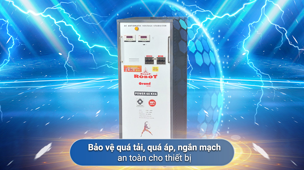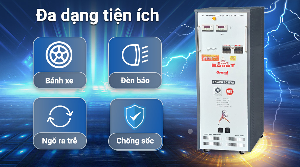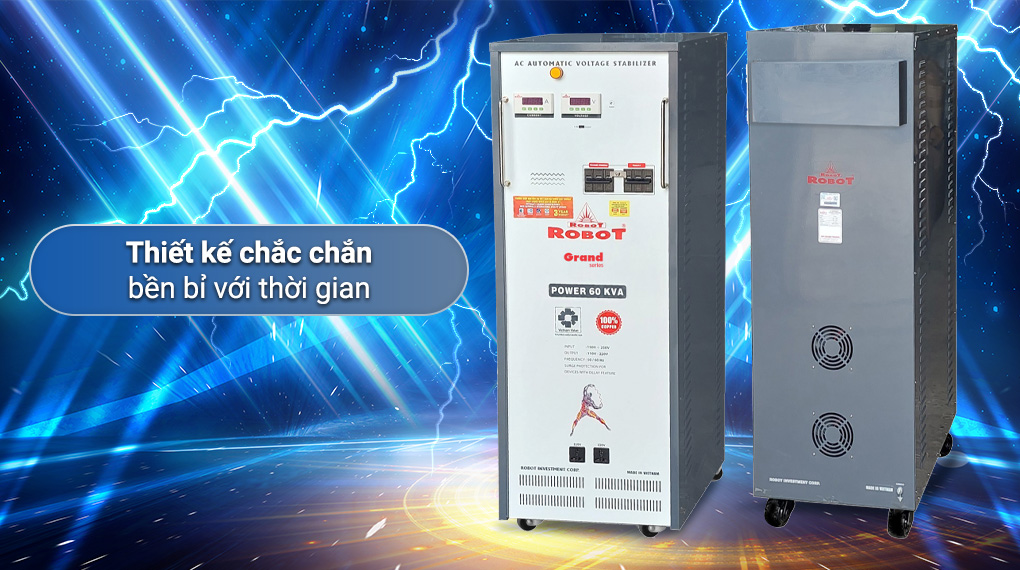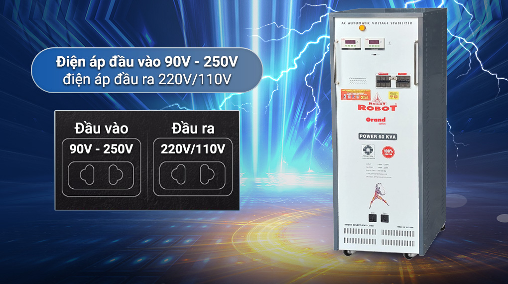 - Robot 60KVA 90 hỗ trợ chuyển đổi điện áp đầu vào 90V - 250V thành điện áp đầu ra 220V/110V, phù hợp với mạng lưới điện được sử dụng phổ biến tại Việt Nam.