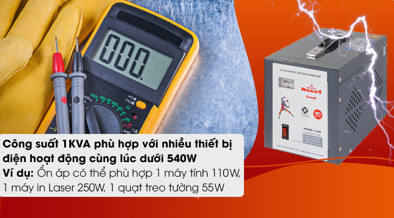 Ổn áp ROBOT có công suất 1KVA thích hợp với gia đình có nhiều thiết bị điện tử với tổng công suất 540 W.