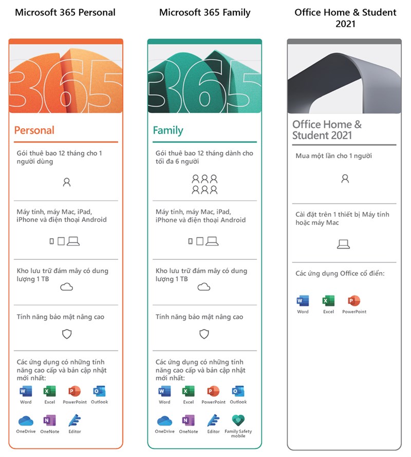 Bộ phần mềm Office của Microsoft 365 Family bao gồm đầy đủ các ứng dụng mạnh mẽ cho văn phòng như: Word, Excel, PowerPoint, OneNote, Outlook và các dịch vụ như: OneDrive, Personal Vault (thư mục bảo mật) và các tính năng bảo mật nâng cao khác với thời hạn bản quyền 1 năm.