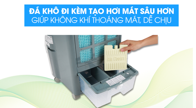 Khi mua quạt sẽ có thêm 2 hộp đá khô, đây là 1 loại đá hóa học, cho hộp đá khô vào ngăn đá tủ lạnh (đá này có thể tái sử dụng) khi muốn làm lạnh. Sau đó cho chúng vào bình chứa nước của quạt sẽ giúp giảm nhiệt độ quạt hơi nước Delites tỏa ra để không gian được mát mẻ hơn (nhiệt độ càng thấp hiệu quả làm mát càng cao).