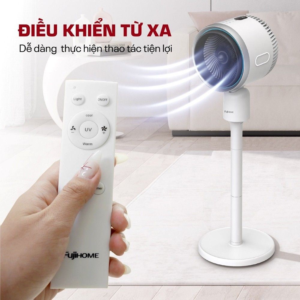 Bên cạnh bảng điều khiển cảm ứng hiện đại, FUJIHOME AC707 còn đi kèm điều khiển từ xa tiện lợi, cho phép bạn dễ dàng điều chỉnh các chức năng như tốc độ gió, chế độ làm mát, hẹn giờ hay xoay hướng gió từ bất kỳ vị trí nào trong phòng mà không cần phải di chuyển. Tính năng này đặc biệt hữu ích trong những lúc nghỉ ngơi, thư giãn hoặc vào ban đêm, khi bạn muốn thay đổi cài đặt mà vẫn giữ được sự thoải mái tối đa.