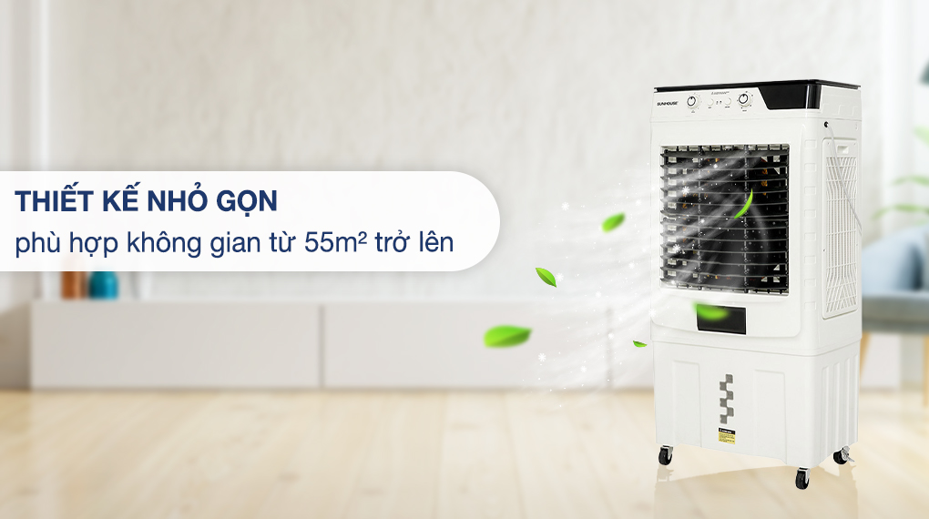 Quạt điều hòa Sunhouse SHD7758 thiết kế hiện đại, màu trắng chủ đạo sang trọng, dễ di chuyển quạt đến nơi cần làm mát nhờ có trang bị bánh xe, phù hợp với không gian mở như nhà hàng, quán cà phê,... có diện tích từ 55m² trở lên.