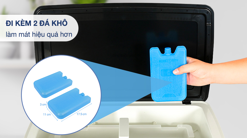 - Đi kèm 2 đá khô giúp làm mát hiệu quả. Đây là 1 loại đá hóa học, khi muốn làm lạnh, bạn cho vào ngăn đá tủ lạnh (đá này có thể tái sử dụng) rồi đặt vào bình chứa nước, đá khô sẽ làm lạnh nước cho hơi nước tỏa ra mát sâu hơn.