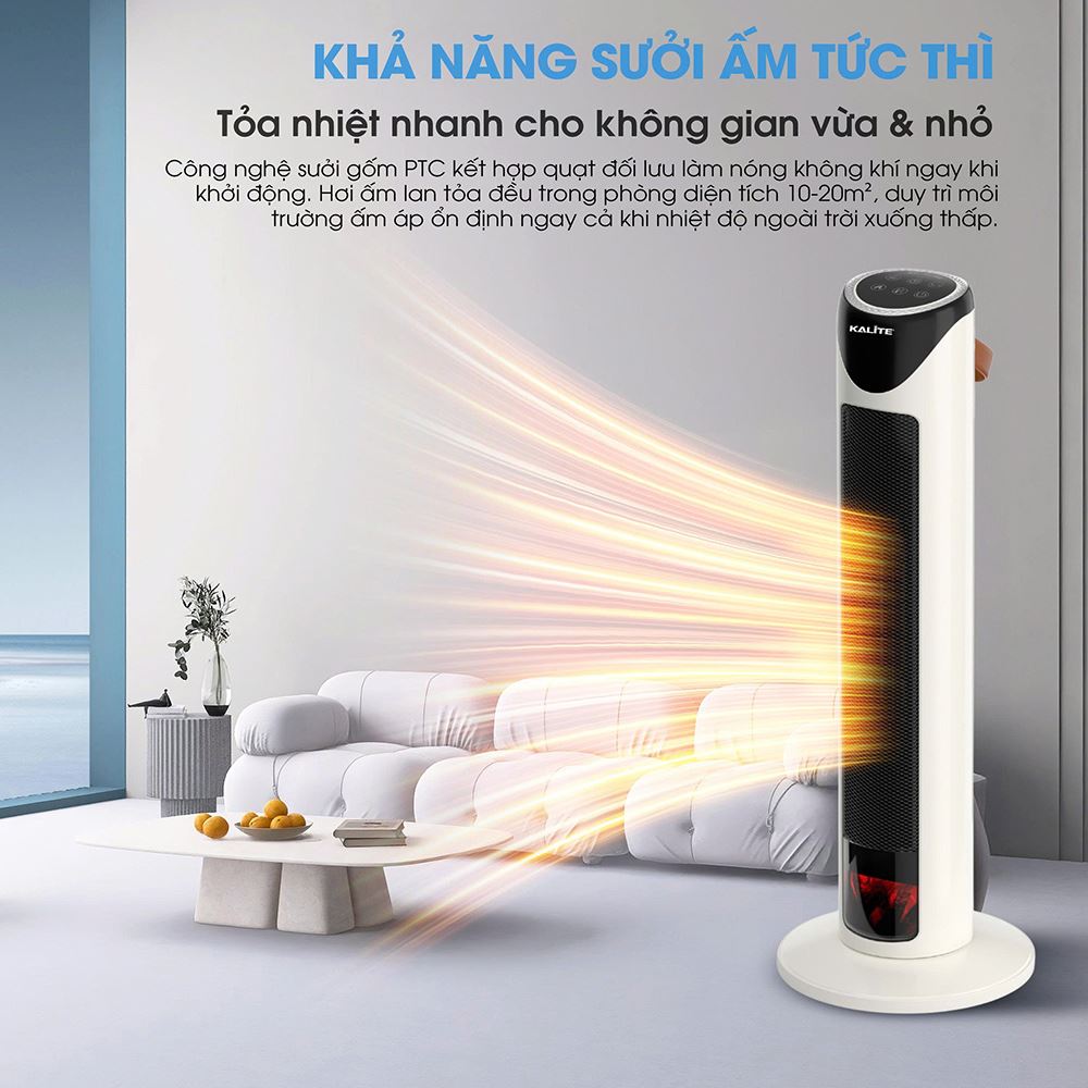 Quạt sưởi gốm Kalite KH25 là thiết bị sưởi sử dụng công nghệ sưởi gốm PTC, phù hợp cho các không gian nhỏ và vừa như phòng ngủ hoặc phòng làm việc. Với thiết kế dạng tháp hiện đại, gọn gàng và khả năng làm nóng nhanh, sản phẩm giúp mang lại cảm giác ấm áp dễ chịu trong những ngày thời tiết lạnh. Ngoài chức năng sưởi ấm, quạt còn tích hợp nhiều tính năng tiện lợi và an toàn, giúp việc sử dụng trở nên đơn giản và thoải mái hơn trong sinh hoạt hằng ngày.