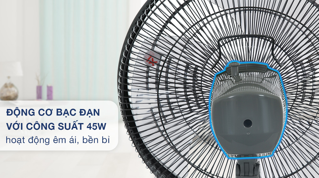 - Mẫu quạt lửng này sử dụng động cơ bạc đạn có độ bền cao, kéo dài tuổi thọ cho động cơ.