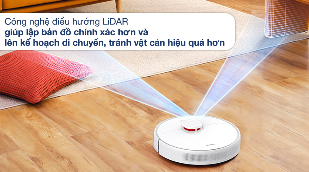 - Sử dụng hệ thống định vị LiDAR kết hợp cùng với cảm biến giúp lau dọn nhanh chóng đồng thời các cảm biến giúp robot tránh vật cản hiệu quả. Bên cạnh đó, các cảm biến thông minh này có thể nhận biết thảm trải sàn để tăng lực hút.