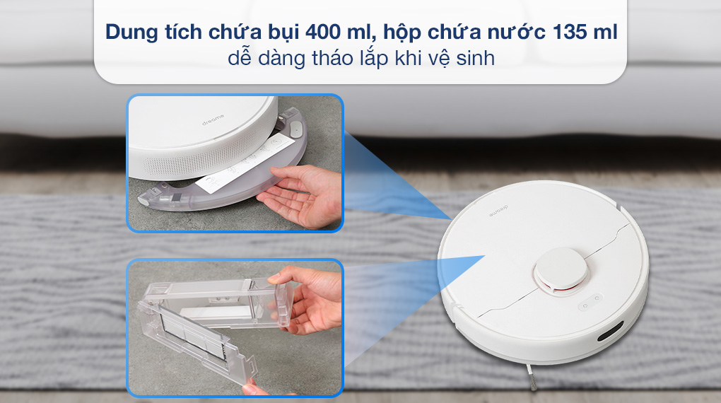 - Dung tích hộp chứa bụi là 400 ml giúp chứa được nhiều bụi bẩn hơn trong một lần dọn dẹp, dung tích hộp chứa nước là 135 ml.