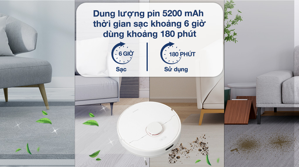 - Pin dung lượng 5200 mAh cung cấp cho máy khả năng hút bụi, lau dọn diện tích lớn chỉ với một lần sạc đầy.