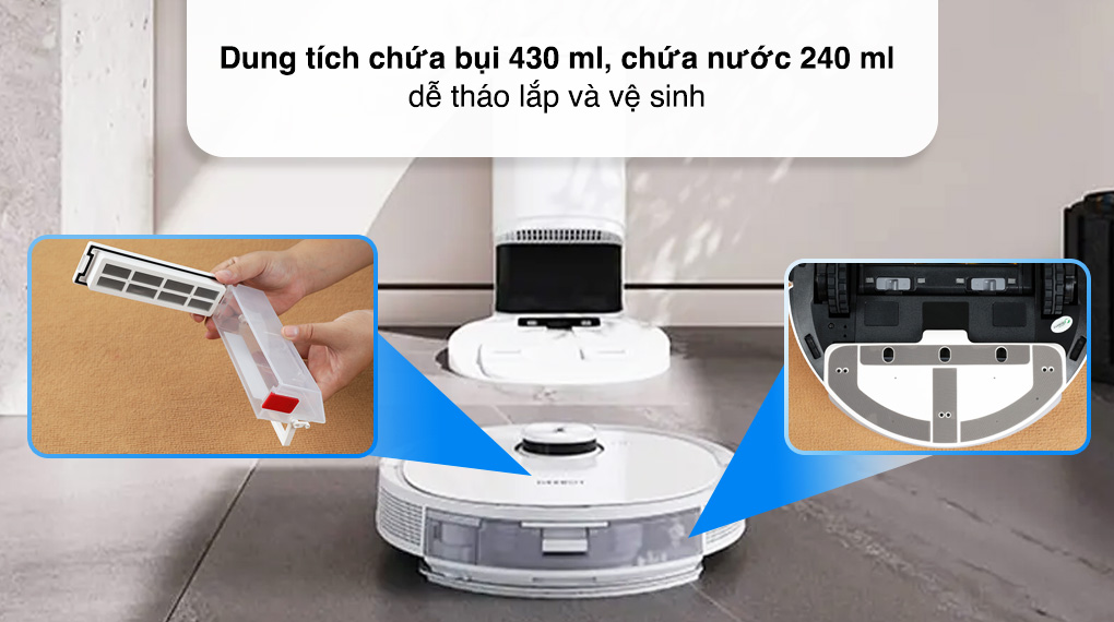 - Chức năng tự động xả rác sẽ thay bạn làm công việc đổ rác, vệ sinh hộp chứa bụi sau mỗi chu trình vệ sinh, túi rác 2.5 lít tích trữ bụi lên đến 30 ngày.