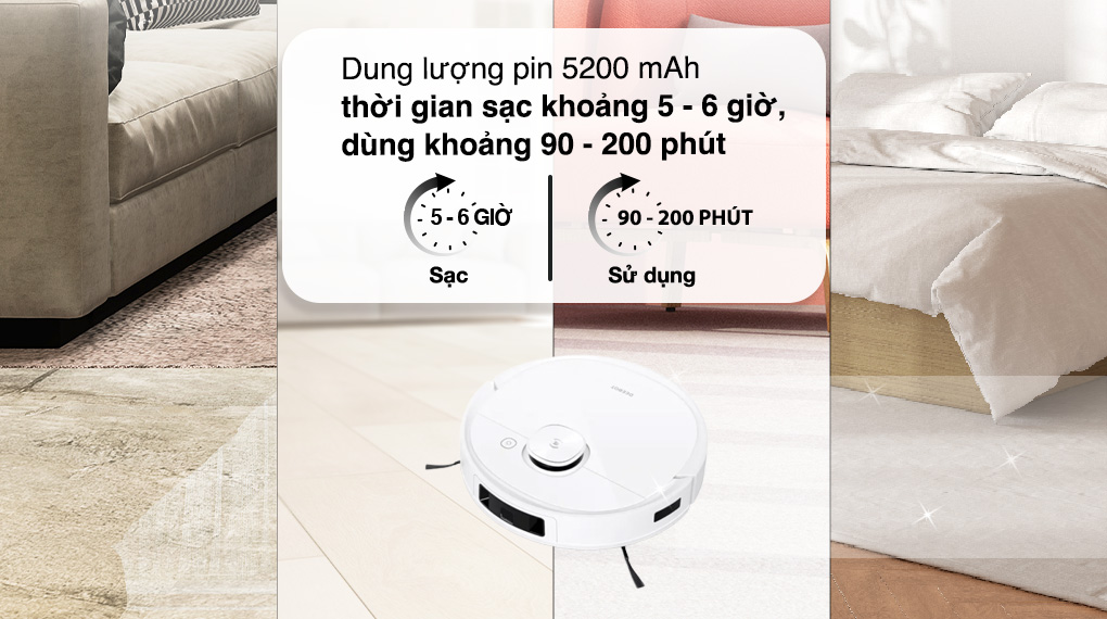 Mẫu robot hút bụi này có dung lượng 5200 mAh, cho thời gian sử dụng khoảng 90 - 200 phút và thời gian sạc tầm 5 - 6 giờ.