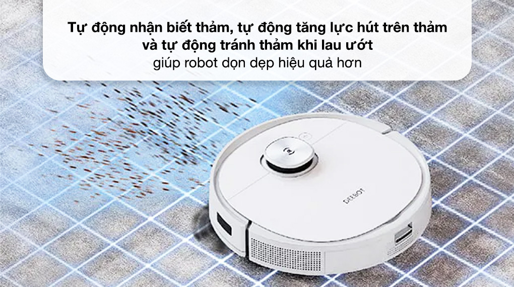 - Robot hút bụi Ecovacs có công suất hoạt động 50W, lực hút mạnh mẽ 3000 Pa.