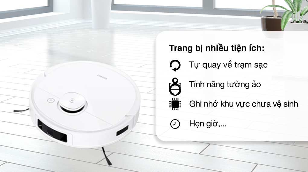 - Điều khiển qua ứng dụng Ecovacs Home với giao diện trực quan, ngôn ngữ tiếng Việt dễ sử dụng. Bạn chỉ cần cài đặt trên điện thoại là có thể điều khiển mọi hoạt động của robot.