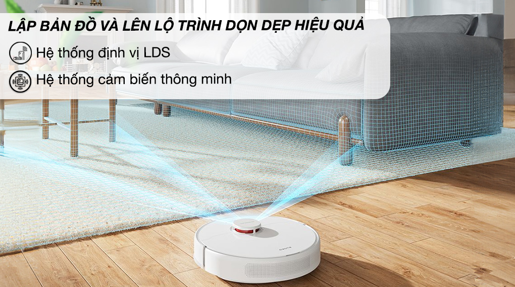 - Hệ thống cảm biến thông minh kết hợp hệ thống định vị LDS giúp robot điều hướng, định vị chính xác không gian sàn và nhận biết tránh vật cản trong nhà. Từ đó robot sẽ thiết lập được bản đồ và lên lộ trình dọn dẹp hiệu quả.