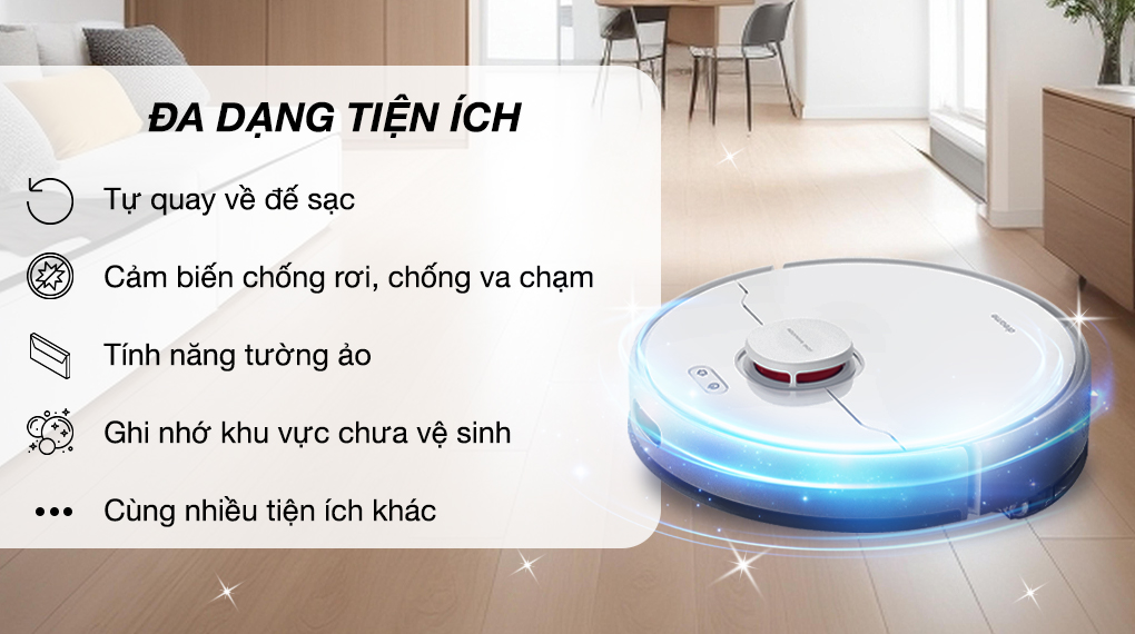 - Có khả năng vẽ tường ảo giúp robot không di chuyển đến những khu vực không cần hút, lau.