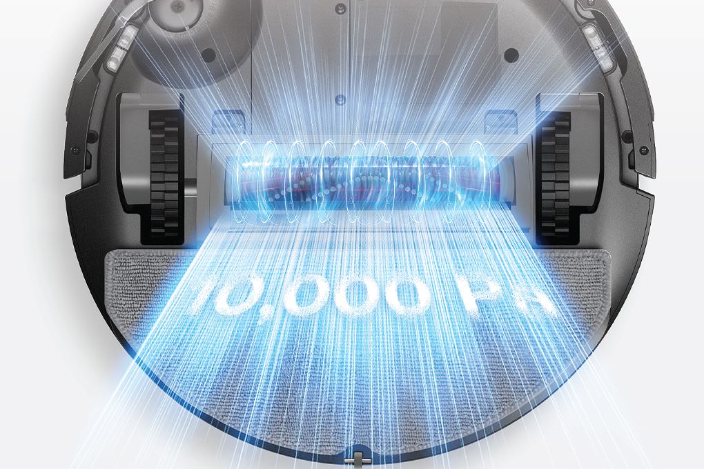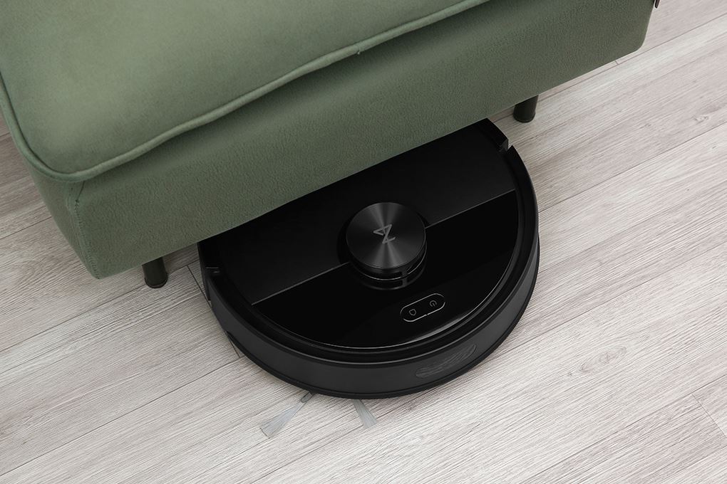Mặt dưới bố trí chổi chính bằng cao su hạn chế rối tóc, chổi cạnh gom bụi dọc tường, bánh xe đàn hồi có thể vượt bậc thấp, cùng khay gắn giẻ lau tiện tháo lắp. Các cảm biến chống rơi được đặt quanh viền đáy, giúp robot an toàn khi di chuyển gần cầu thang hoặc mép sàn.