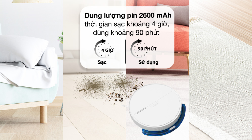 Robot hút bụi cung cấp thời gian sử dụng đến khoảng 90 phút, khi pin sắp hết, bạn có thể sạc trong vòng khoảng 4 giờ đồng hồ.