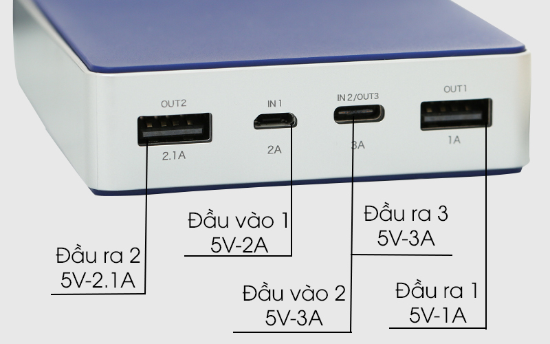 Sạc có 2 cổng USB công suất lần lượt là 5V - 2.1A, 5V - 1A và 1 cổng USB Type C sạc nhanh 5V - 3A. Đầu vào có 1 cổng Micro USB 5V - 2A, cổng USB Type C còn đóng vai trò là nguồn vào.